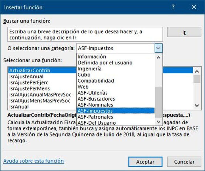 En términos generales; debes seleccionar, la Categoría que contiene la Función que necesites usar, en acuerdo con el cálculo que desees hacer, todas las Funciones ASF, generalmente requieren únicamente de UNO a TRES parámetros, sin embargo... En casos muy en particular; pueden ser de un máximo de quince (15) Parámetros para poder generar el cálculo solicitado.